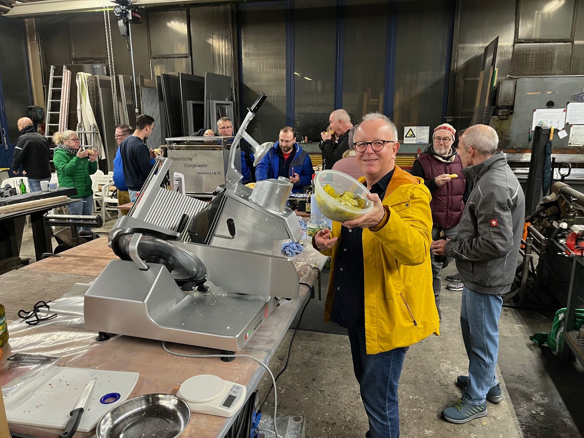 Am Freitag, den 17.11.2023 trafen sich Helfer der Vereine, in Vorbereitung auf den Singenden Weihnachtsbaum, bei Andreas Lemminger in dessen Werkstatt, um den richtigen Umgang mit einer professionellen Käseaufschnittmaschine und Gemüseschneider zu erlernen.